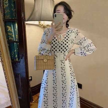 Long Sleeve Stand Collar Plain Frill Blouse / Cherry Embroidered Bow Ruffle Midi A-Line Overall Dress
