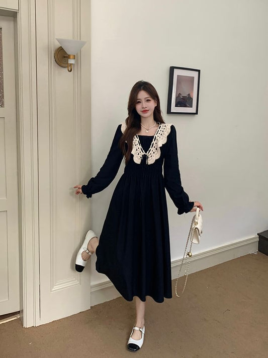 Long Sleeve Square Neck Lace Panel Midi A-Line Dress