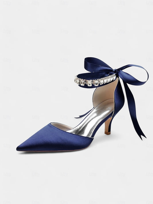 and Heels with Blue Ankle Strap Rhinestone Satin Pointed-Kitten