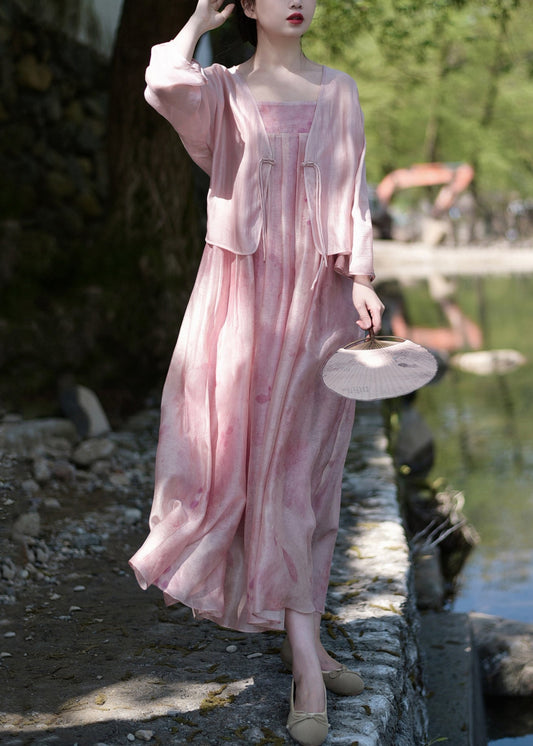 Elegant Pink Button Print Linen Silk Two Pieces Set Spring AA1059