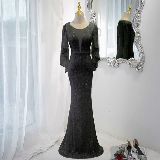 Flared-Sleeve Sequin Mermaid Evening Gown