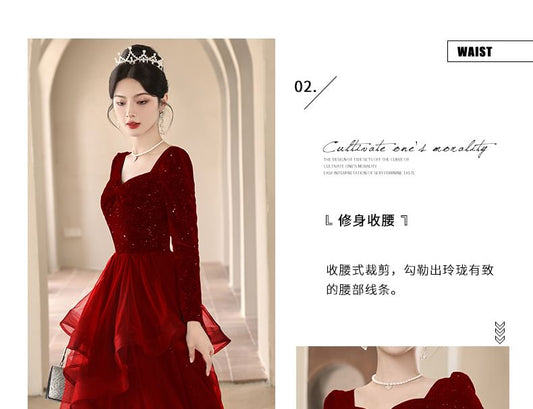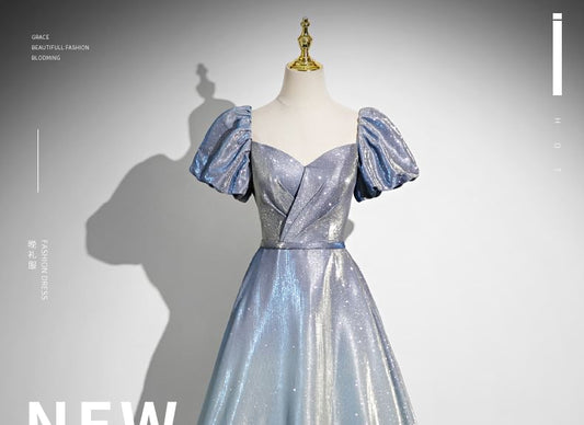 Puff-Sleeve Flower Embroidered Sequin A-Line Evening Gown