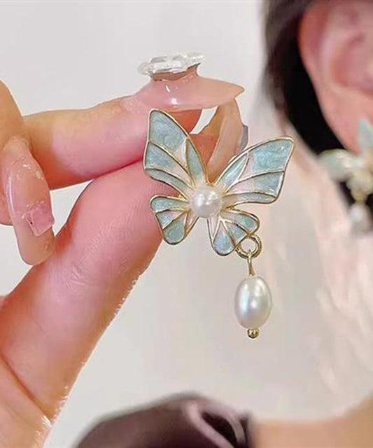 Stylish Blue Sterling Silver Overgild Pearl Butterfly Enamel Drop Earrings WH030