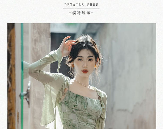 Set: 3/4-Sleeve Sheer Top + Sleeveless Print Maxi A-Line Dress