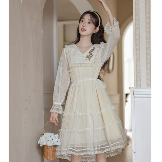 Long Sleeve V-Neck Floral Embroidered Midi A-Line Dress / Faux Pearl Open Front Jacket
