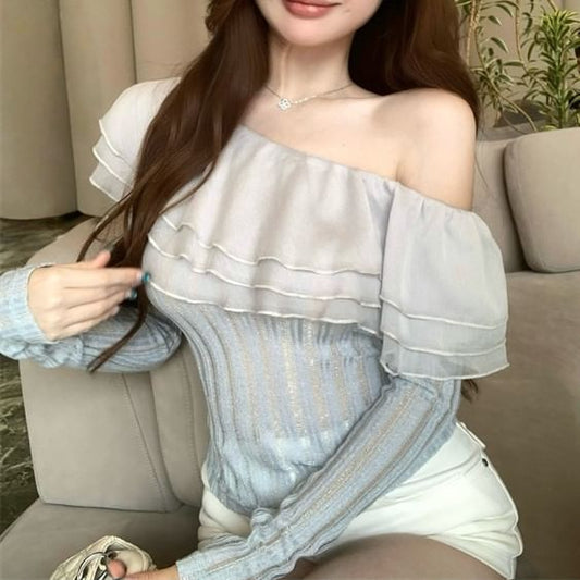Plain Trim Crop Glitter Top One Long-Sleeve Shoulder Ruffle