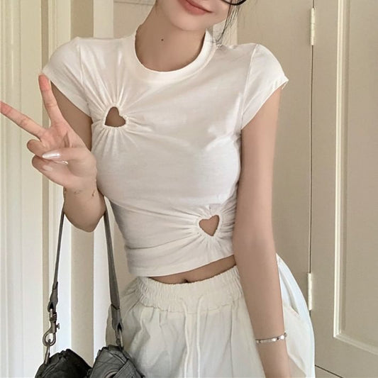 Neck Plain Crew Short-Sleeve T-Shirt Cutout Cropped