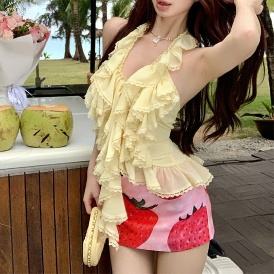 Skirt Mini / Waist Strawberry Print Pencil Top High Halter Ruffle Plain