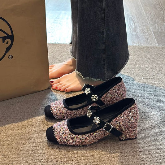Pumps Metal Heel Sequin Jane Chunky Accent Mary