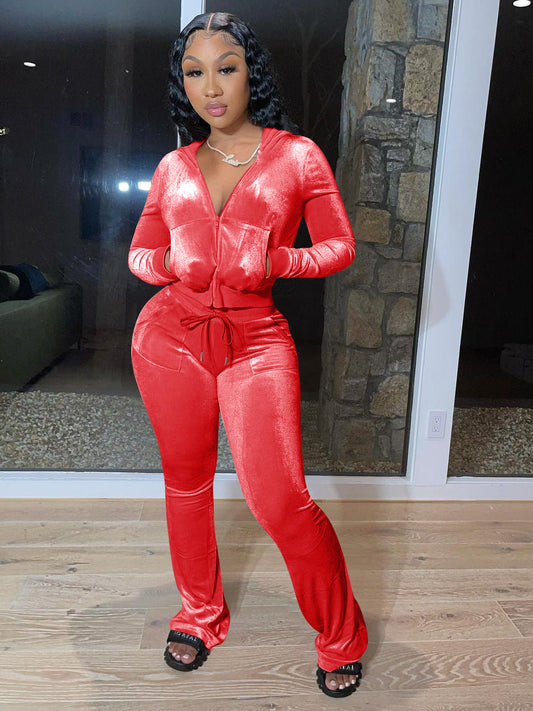 Autumn Zipper Hooded Collar 2 Piece Pant Sets F3884