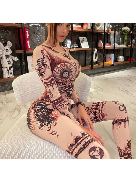 Vintage Printed Long Sleeve Bodycon Jumpsuits Women AD426