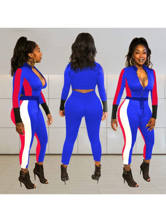Casual Colorblock Zipper Top And Skinny Trouser Sets PY178