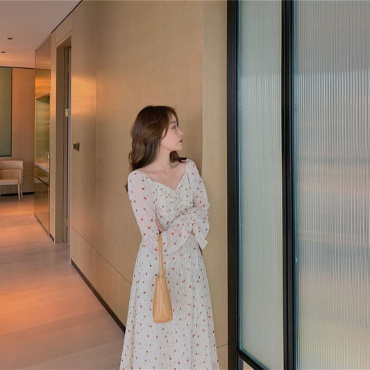 Langärmliges Chiffonkleid mit eckigem Ausschnitt und Kordelzug und Blumenmuster