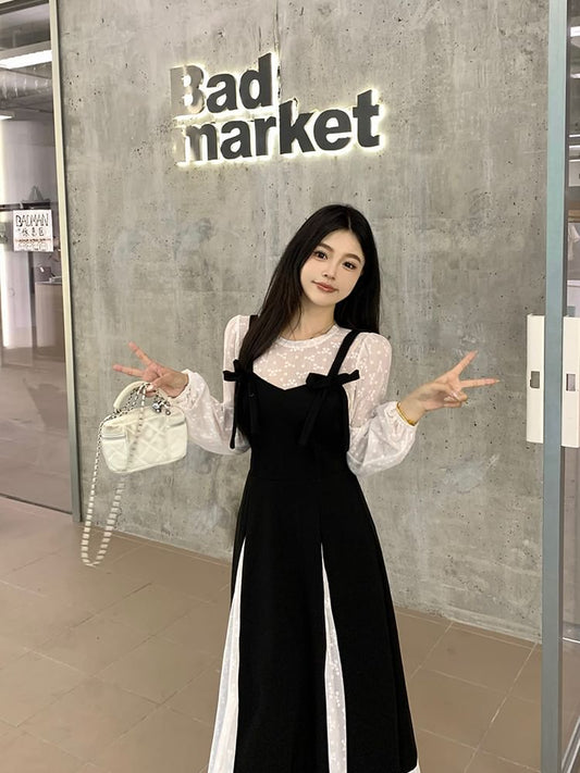 Long Sleeve Ruffle Hem Bow Print Mock Two Piece Midi A-Line Dress