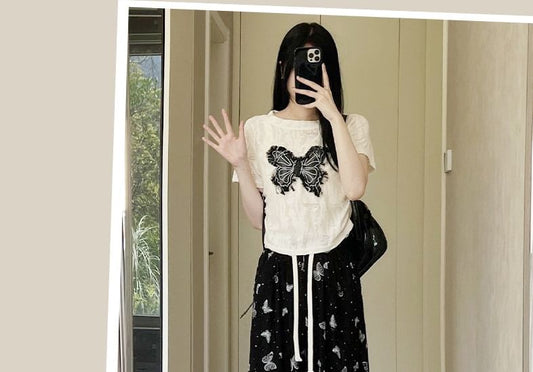 Butterfly Pockets Style Pants Chinese Print White Floral Draping