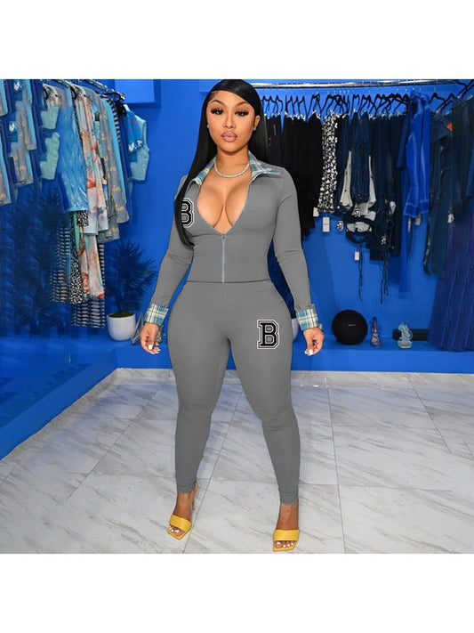 Lässiger karierter Hosenanzug mit Buchstabenmuster für Damen AD445