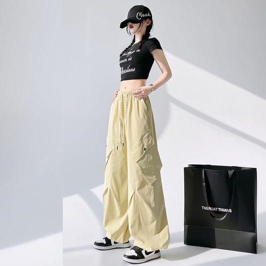 Drawstring Wide Leg Waist Plain Cargo Pants