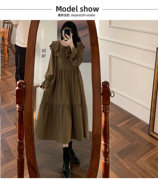 Long-Sleeve Ruffle Plain Midi A-Line Dress