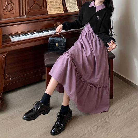 Spaghetti Strap Plain Frill Panel Button Midi A-Line Dress / Long Sleeve Collared Mock Two Piece Crop Top