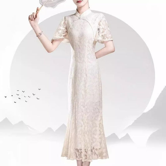 Short Sleeve Mandarin Collar Lace Midi Sheath Dress