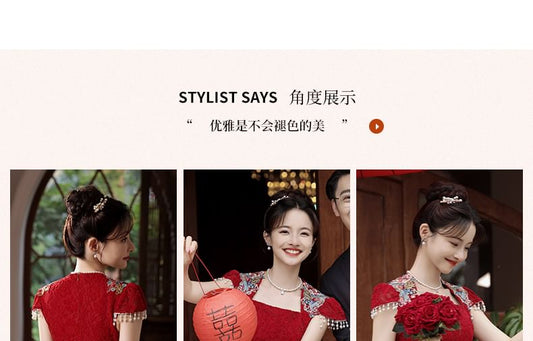 Short-Sleeve Square-Neck Floral Embroidered Lace Bodycon Evening Gown