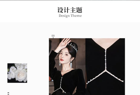 Long-Sleeve V-Neck Contrast Trim A-Line Evening Gown