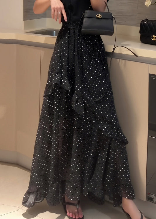Side Black Fine Dot Chiffon Open Ruffled Summer Patchwork Skirt