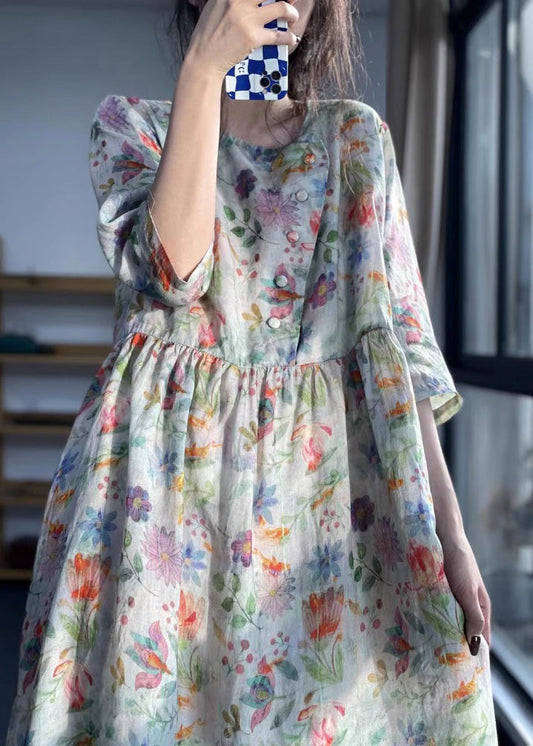 Vintage O Hals Print Patchwork Baumwolle Kleid Armband Ärmel LK012