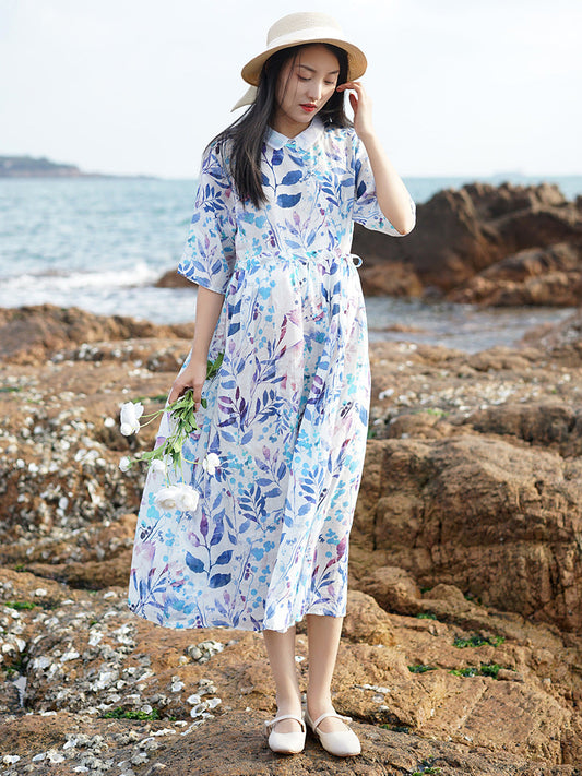 Damen Sommerkleid mit kunstvollem Pflanzenprint und Trägern aus Ramie CC032