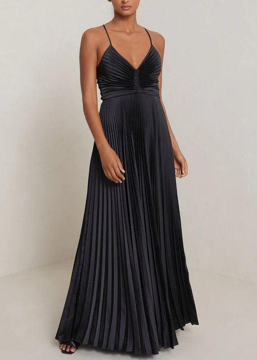Schwarzes, hoch tailliertes, langes Baumwollkleid mit seitlicher Öffnung, Sommer WW1049