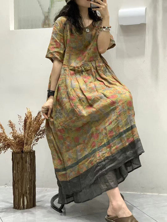 Damen Sommer Blumen Kunstvoll Gespleißtes Maxi Ramie Kleid UI1003