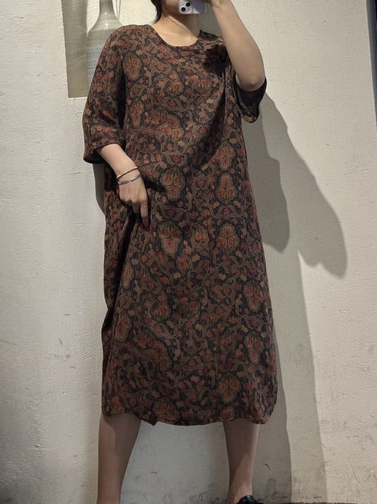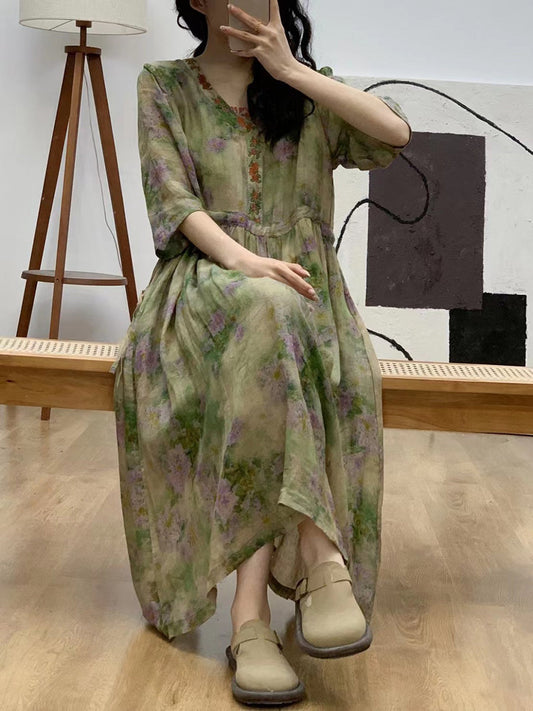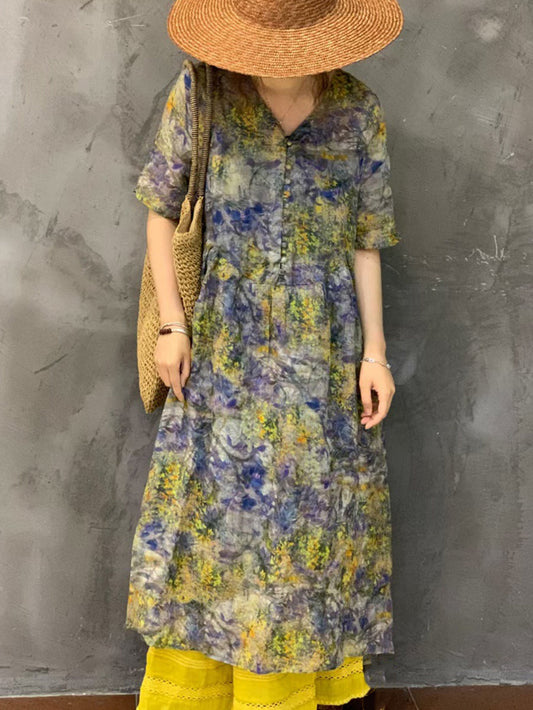 Frauen Sommer Vintage Blume Ramie Knopf Kleid UI1002