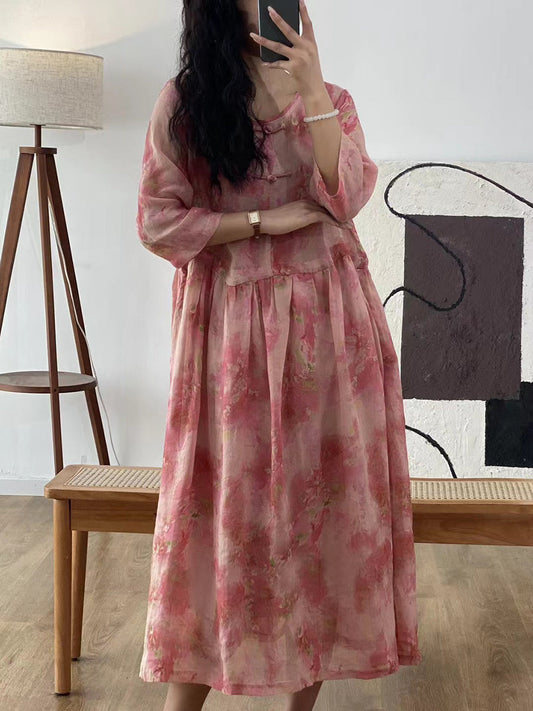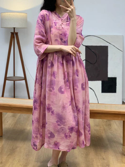 Frauen Sommer Floral Vintage Stehkragen Ramie Kleid AA1006