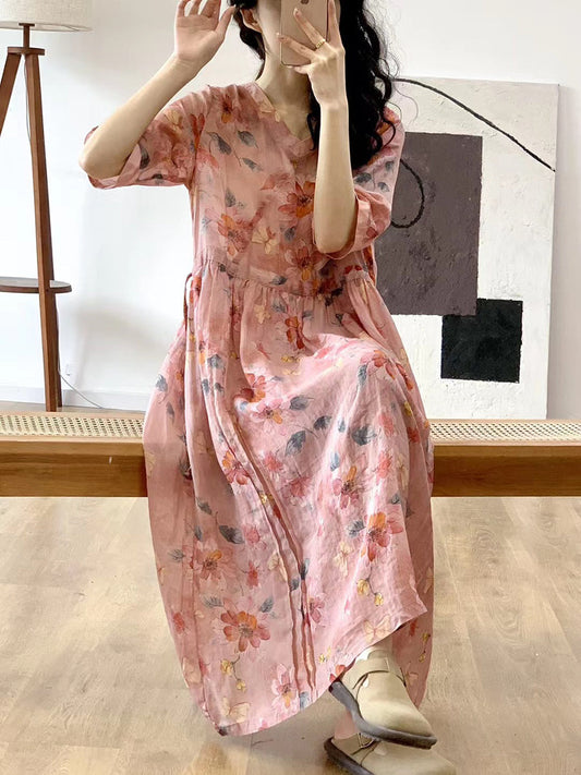 Damen Sommerkleid aus Leinen mit Blumenmuster und V-Ausschnitt QW1023