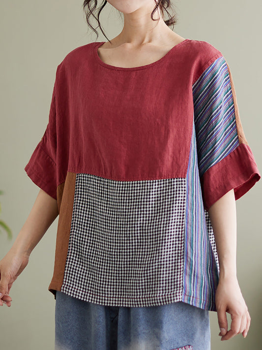 Plus Size Vintage Kurzarm Damen Patchwork Lockeres Hemd QW1031