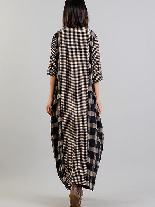 Übergröße, verschiedenfarbiges kariertes Retro-Baumwollleinenkleid AA1054