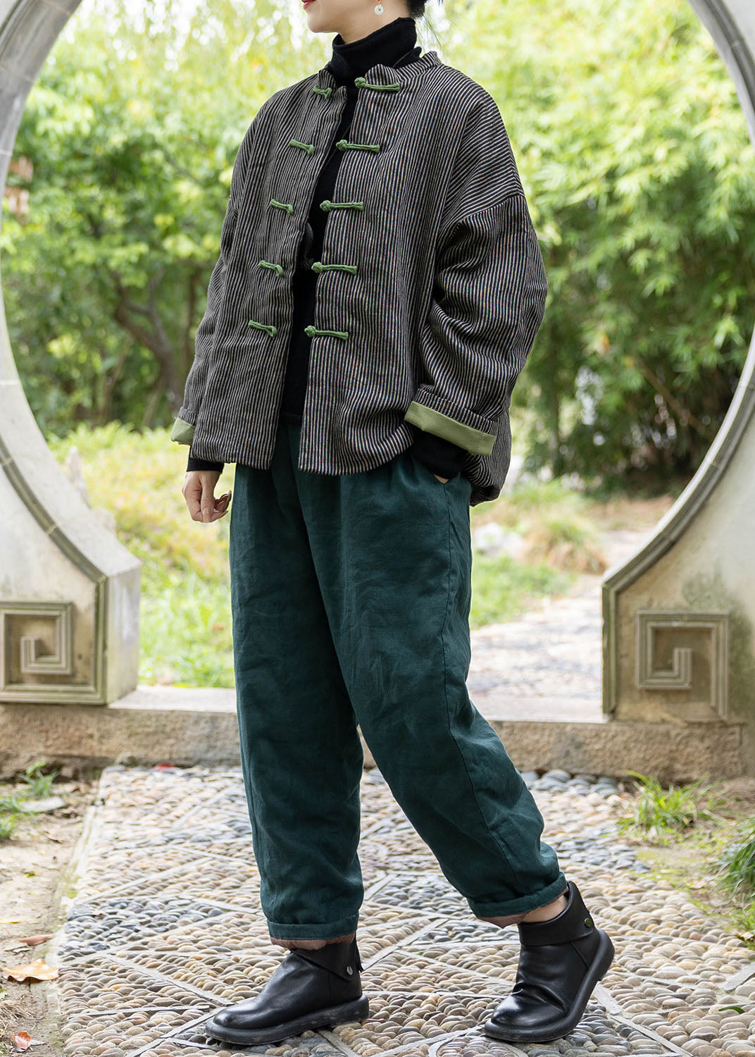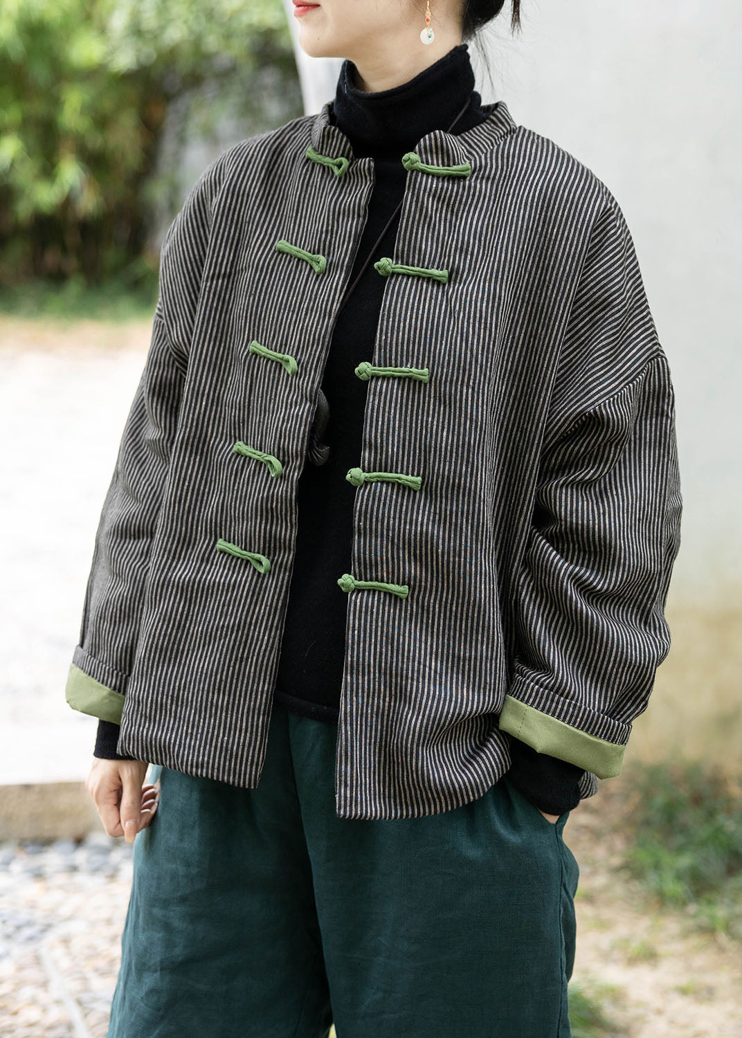Elevate your spring wardrobe with our luxurious Black Fine Cotton Filled Coat. Featuring a stand collar and Chinese button details, this coat exudes sophistication and exclusivity. Made of high-quality cotton, it is the perfect blend of fashion and function.
