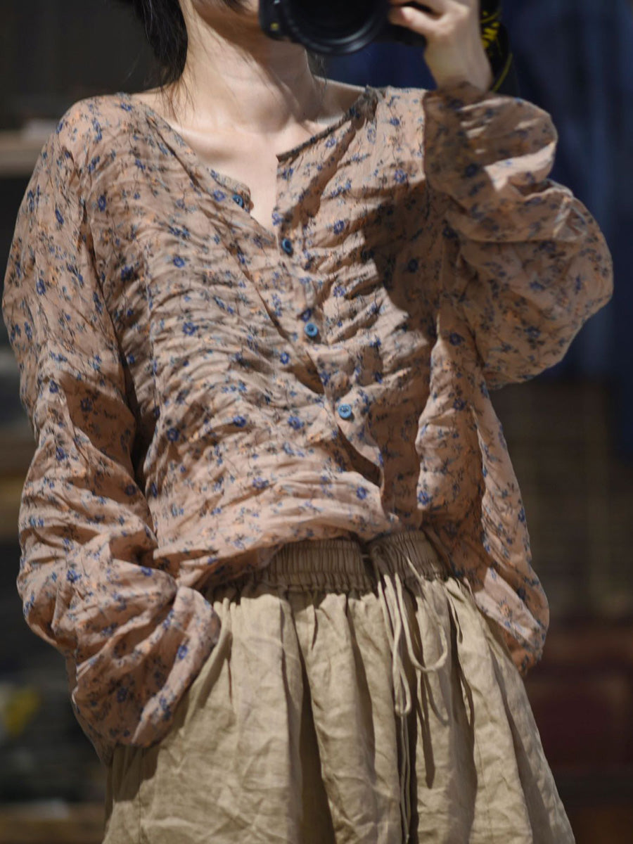 Button Shirt Floral Ramie Women O-Neck Vintage Autumn