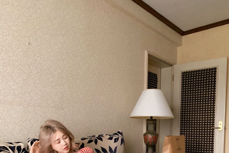 Long-Sleeve Gingham Button-Up Crop Mesh Top