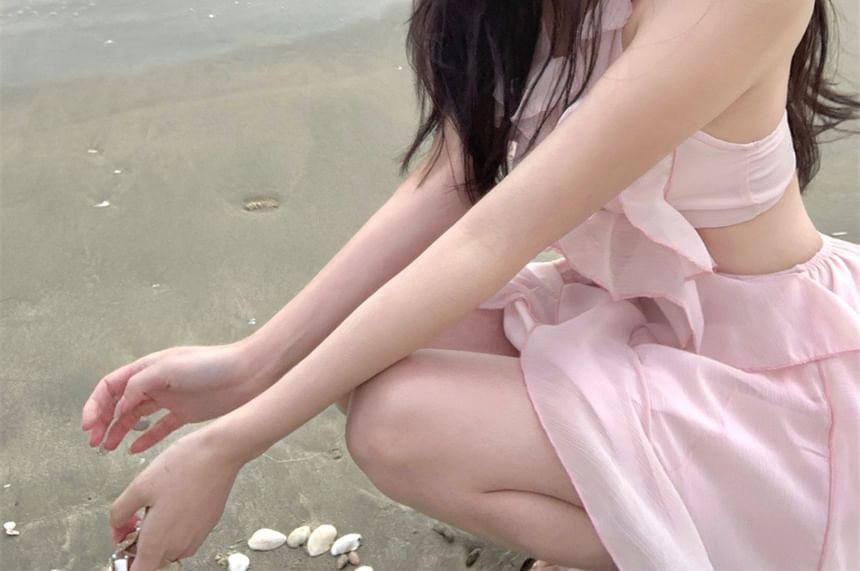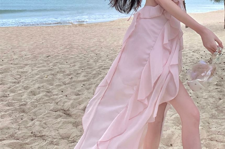Dress Mini Ruffle Plain Neck Trim Cutout A-Line Halter