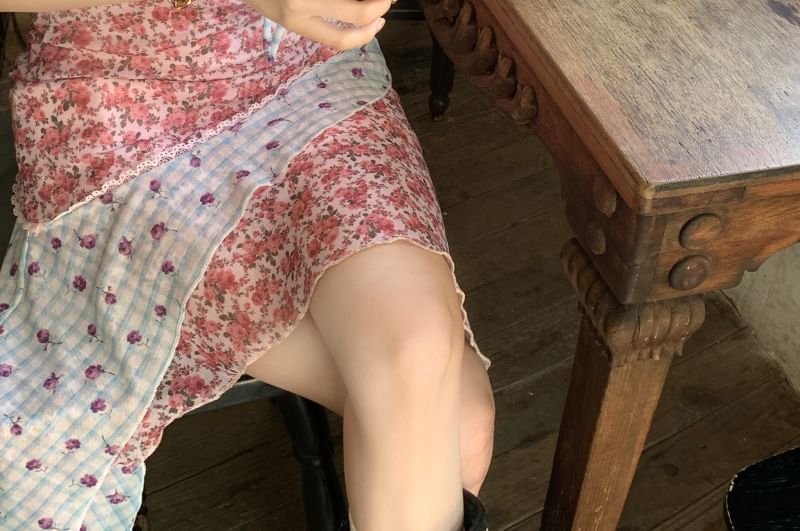 Spaghetti Strap Floral Print Panel Asymmetrical Mini Bodycon Dress