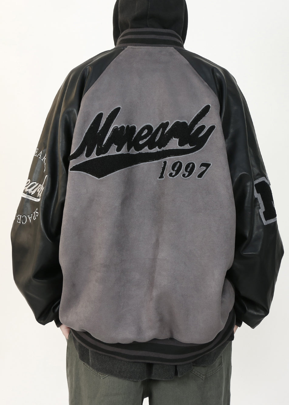 French Grey Letter Faux Leather Patchwork Faux Suede Mens Coat Spring TC013