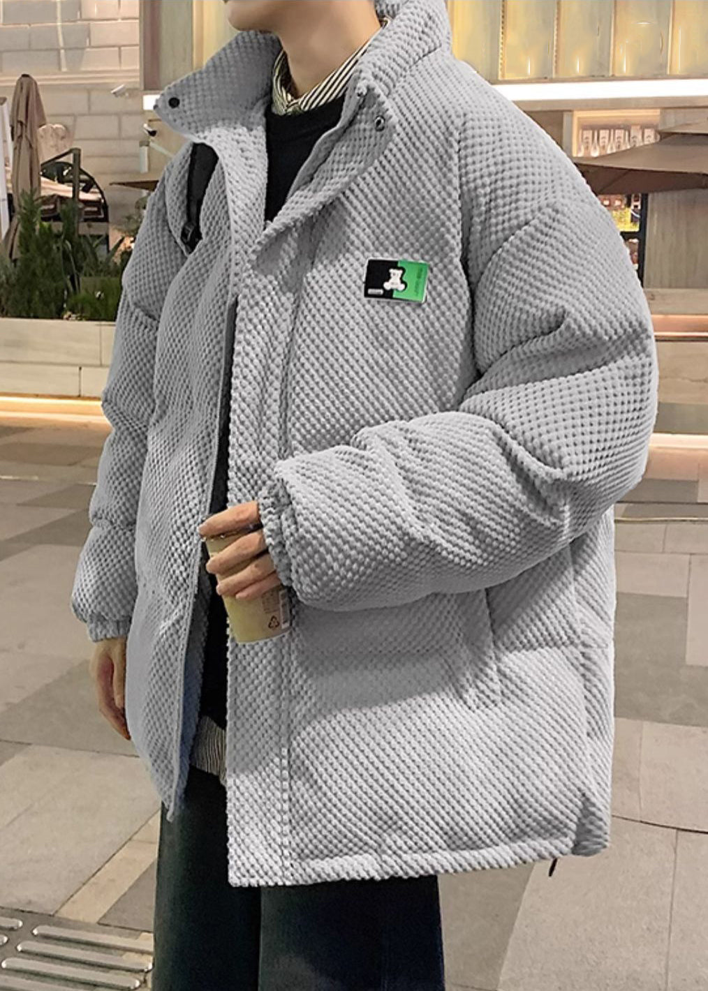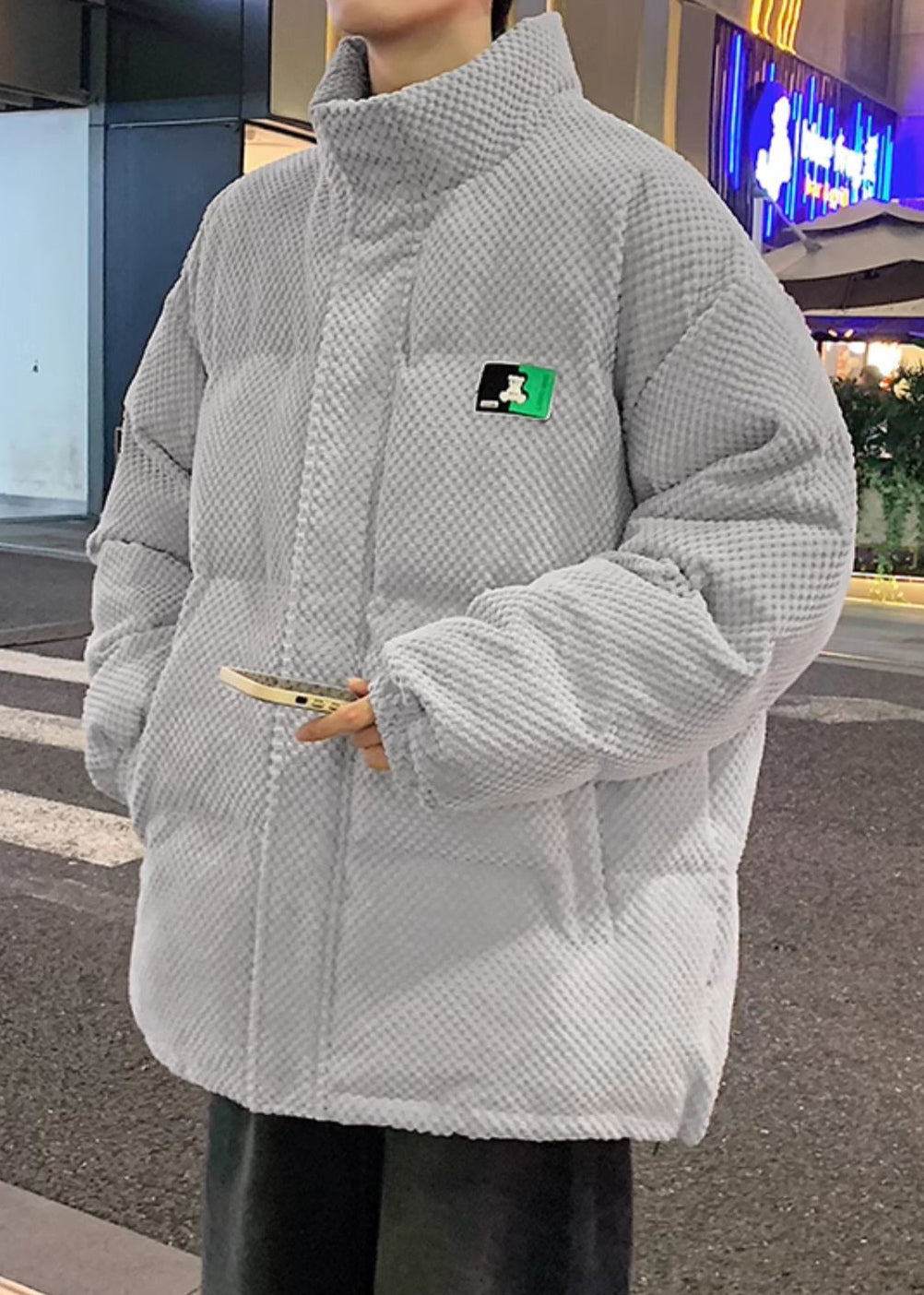 Grey Drawstring Solid Men Parkas Stand Collar WinterRM011