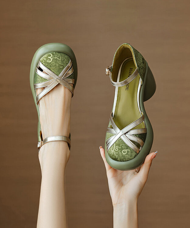 Leather Buckle Splicing Black Sandals Cowhide Chunky Strap Heel
