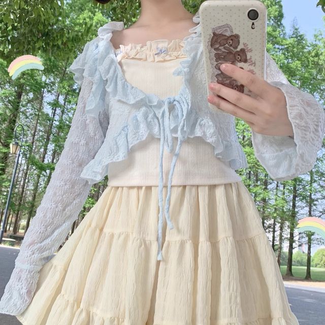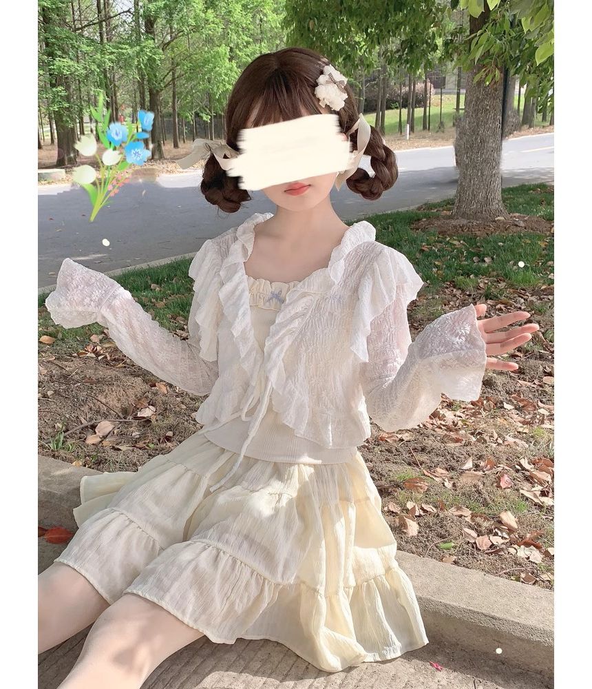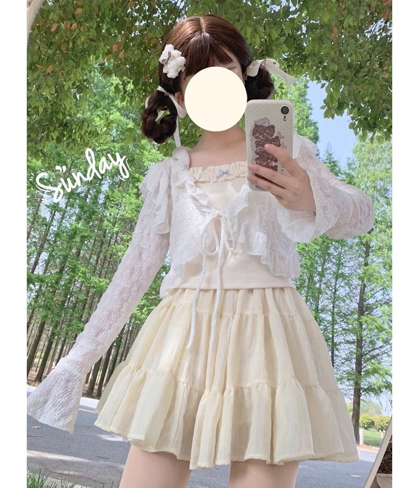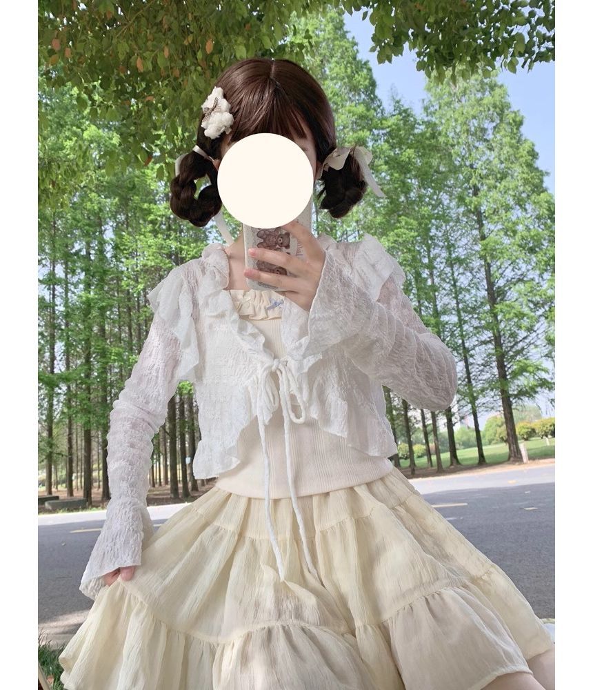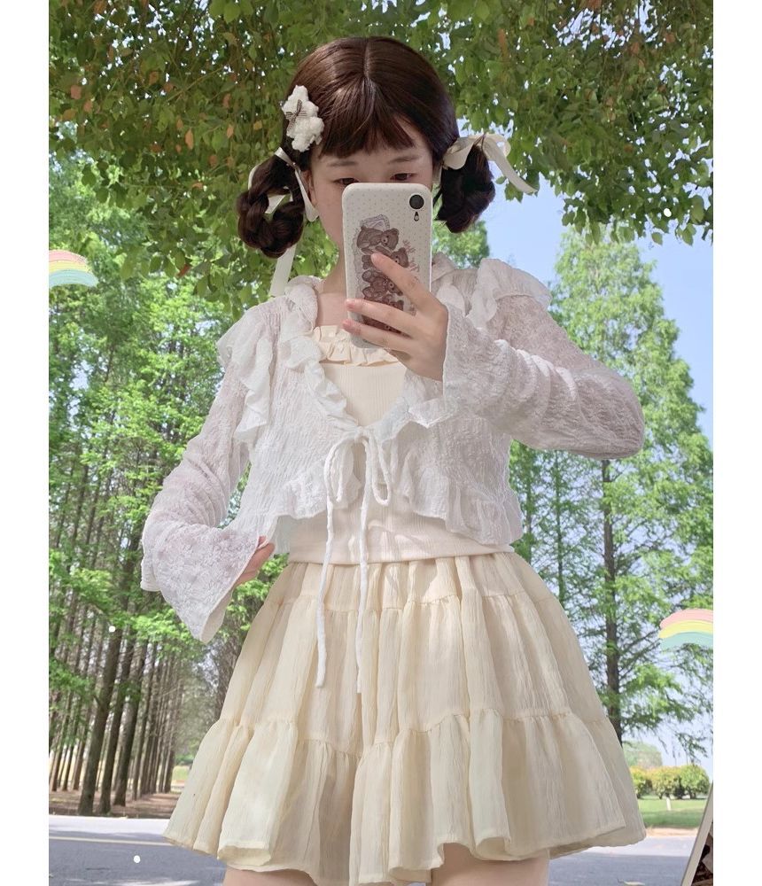 Long-Sleeve V-Neck Plain Ruffled Drawstring Crop Knit Top