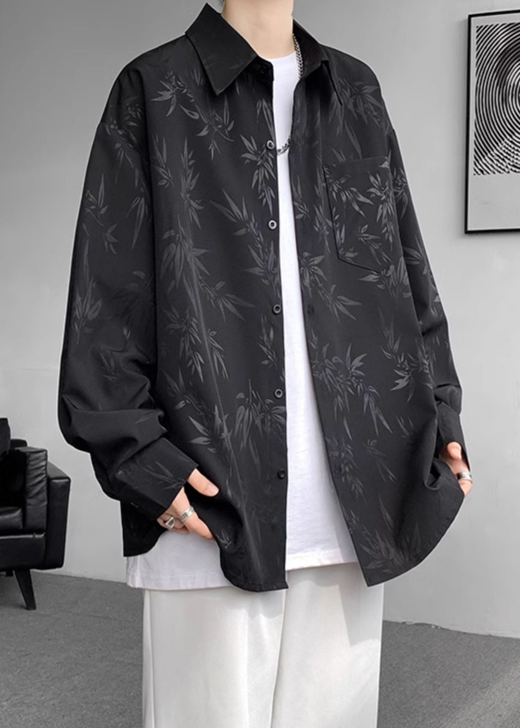 Experience unparalleled elegance with our meticulously crafted Loose White Peter Pan Collar Button Print Cotton Mens Shirt, perfect for the refined gentleman in the Fall season.