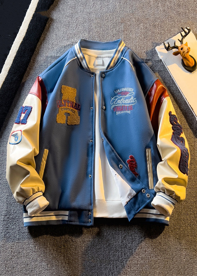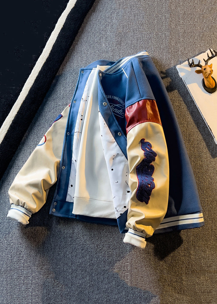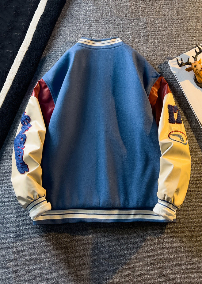 New Blue Button Faux Leather Patchwork Mens Coats Spring TC057