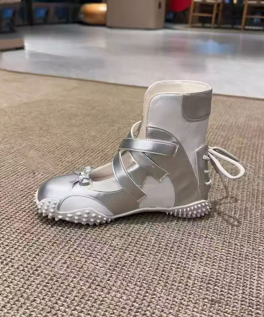 Nude Up Fashion Lace Bow Leather Shoes Faux Splicing Flats