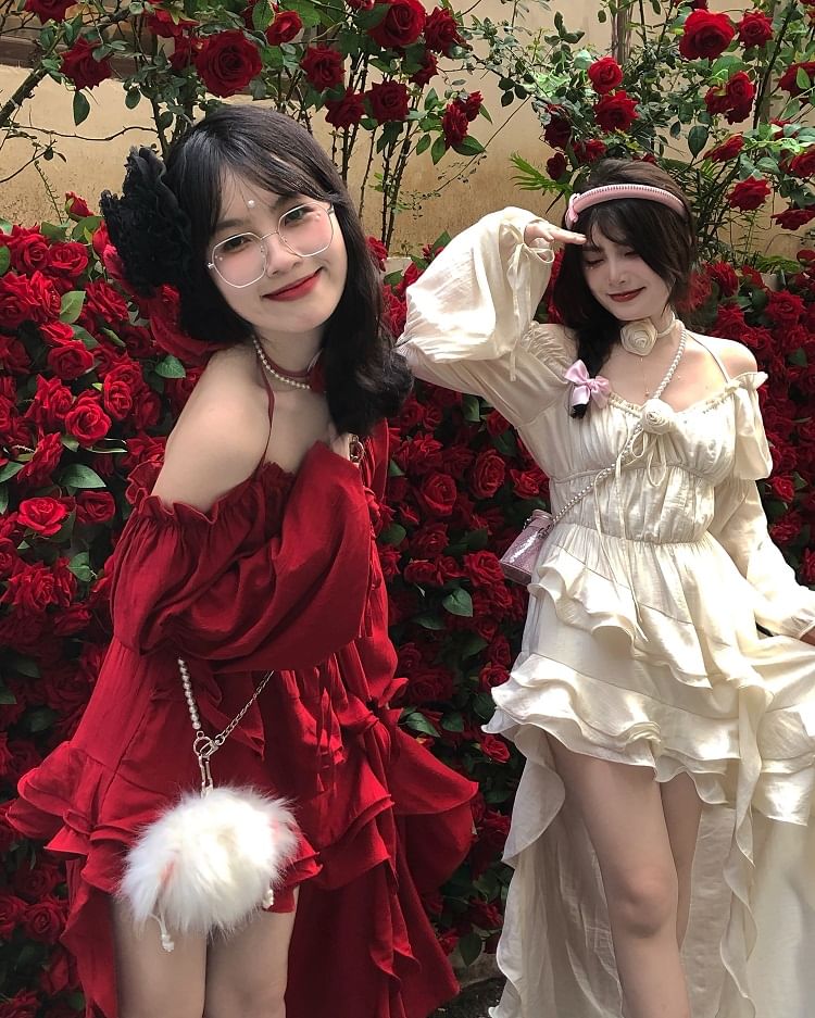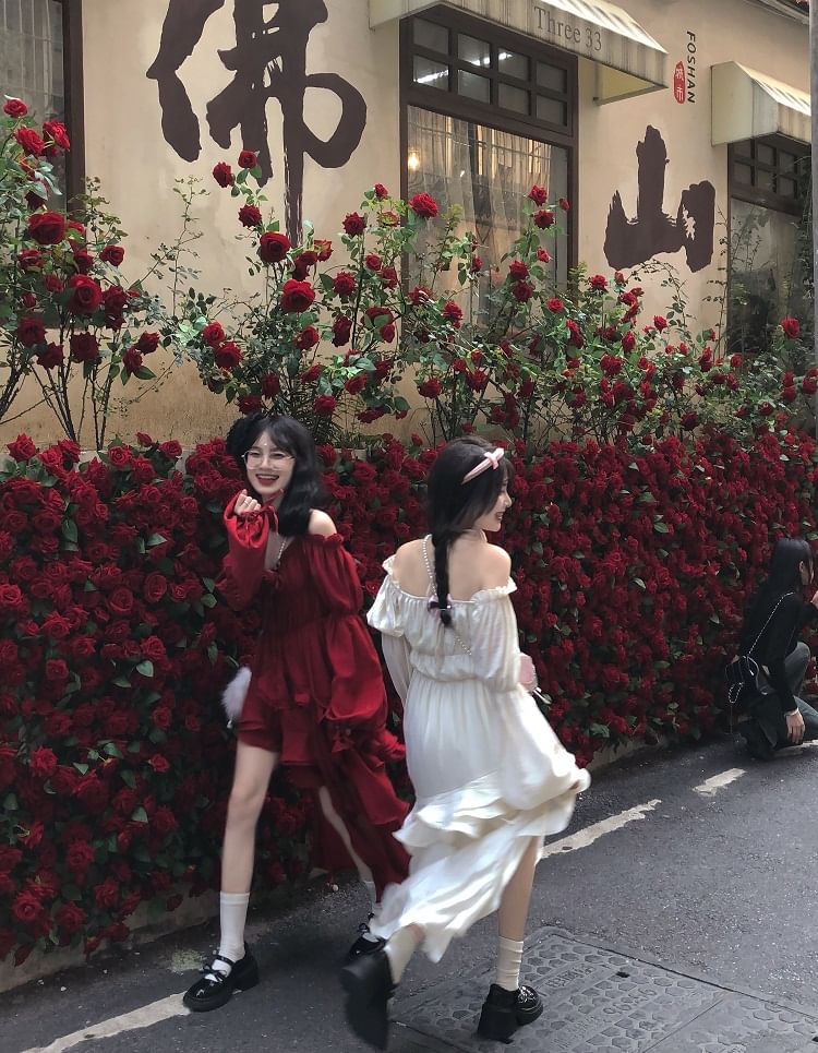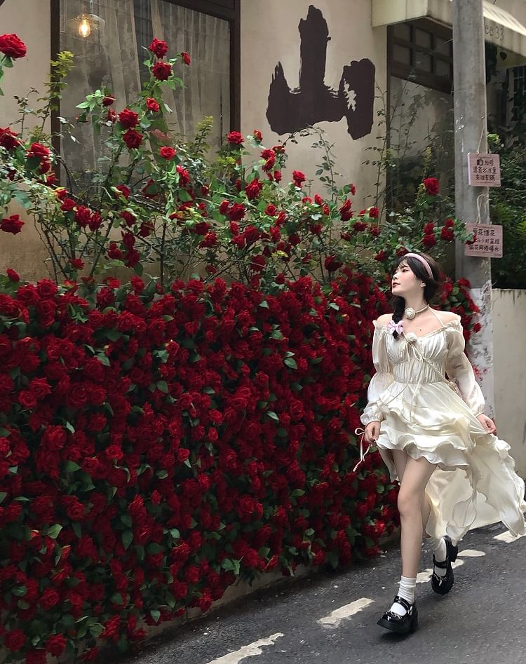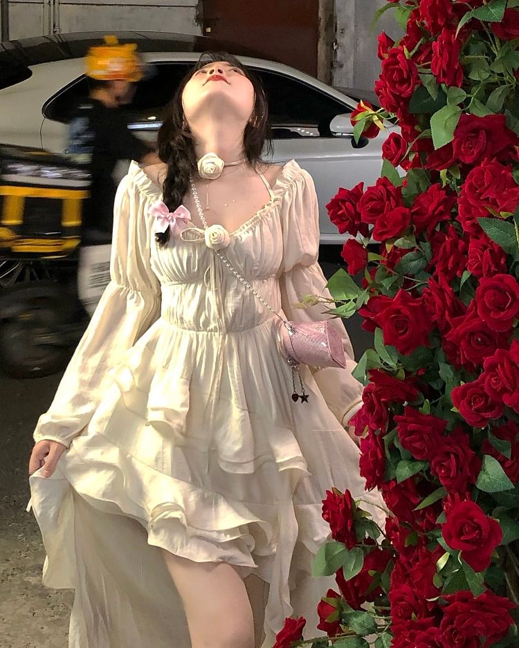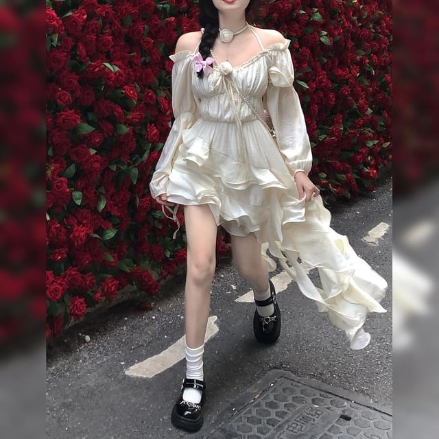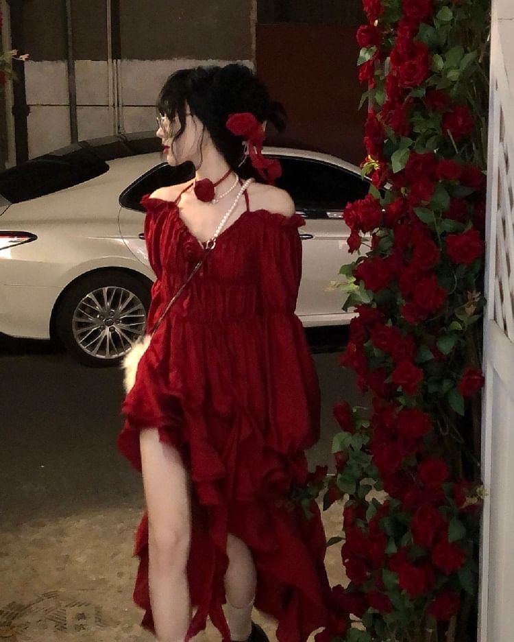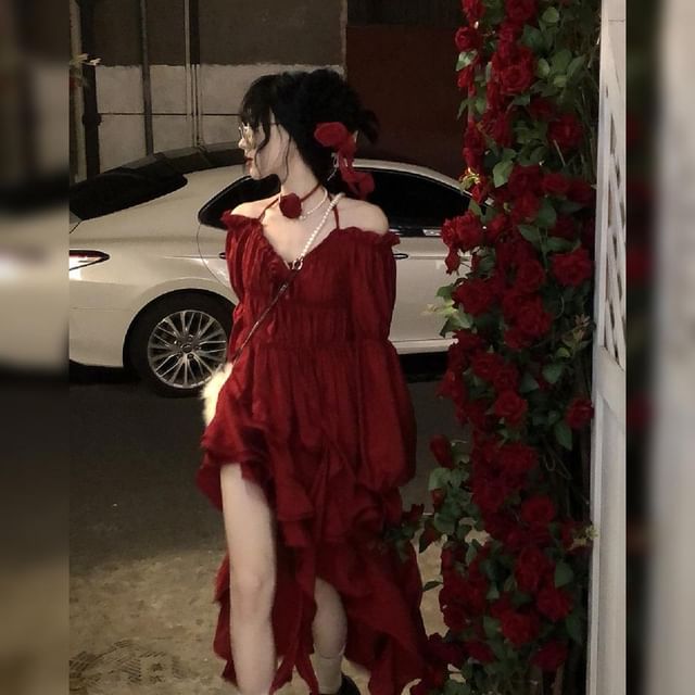 Puff-Sleeve Cold-Shoulder Plain Ruffle Asymmetrical Midi A-Line Dress