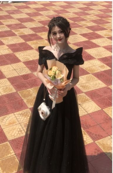 Short-Sleeve Off Shoulder Plain Sequin Mesh A-Line Evening Gown